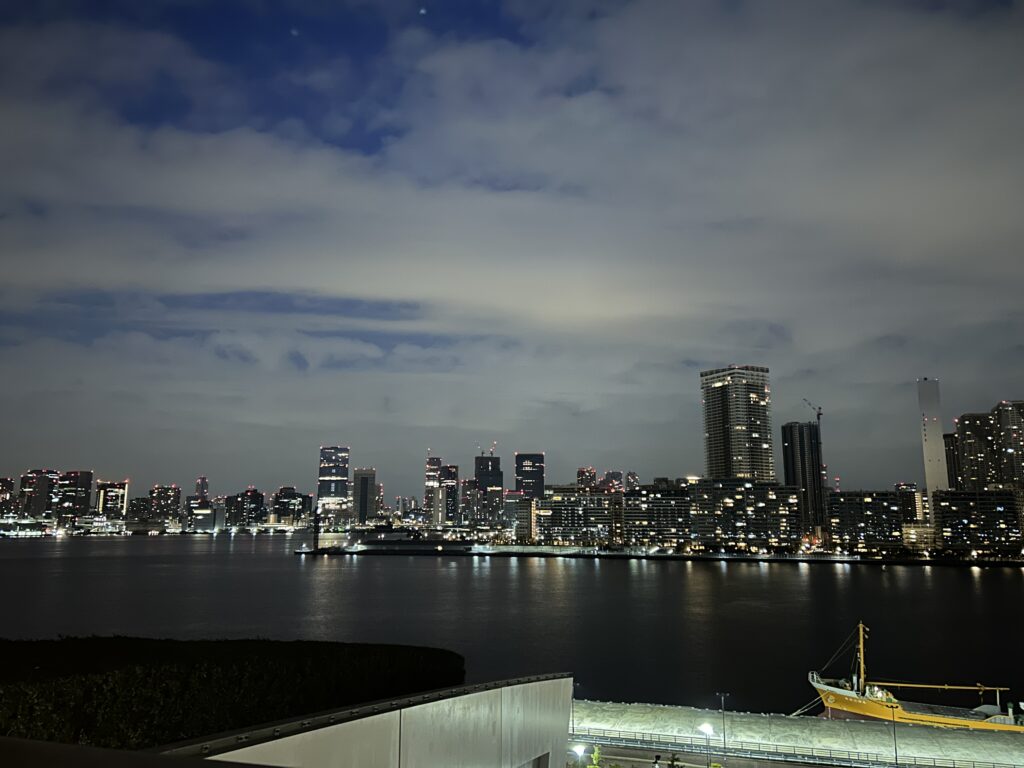 温泉やグルメで話題の千客万来もぜひ利用いただきたいのですが、それ以外にも、食べたりコーヒーを飲んだり、買い物をしたりするエリアが卸売市場棟にもあります。一般の方で歩けるエリアで、屋上緑化広場もあります。こちらから望む、晴海フラッグの眺望に感じる、親しみ(笑)