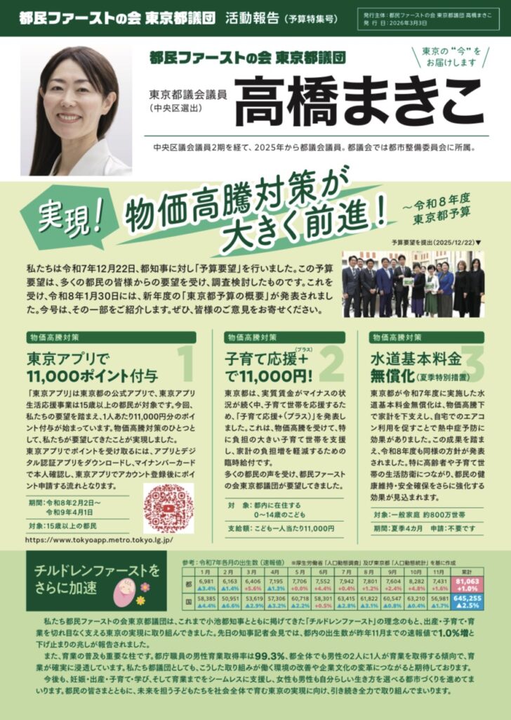 都政・都議会レポート「予算号」を発行します。4月からの新年度予算、事業のポイントをまとめました。東京ポイント11,000円分や、14歳までの子どもに向けた11,000円付与をはじめとした、政策実現を取りまとめています。ぜひご覧ください。みなさまの感想もお待ちしています。
