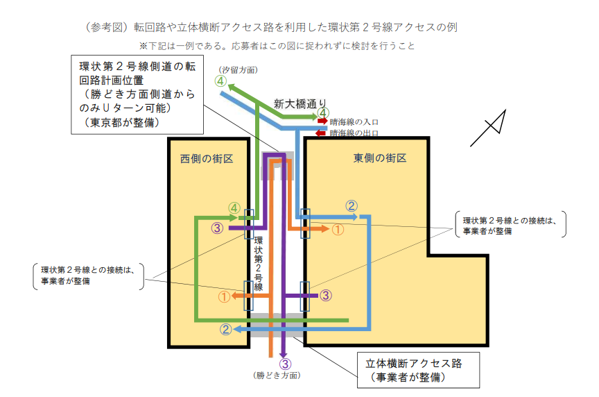 築地の出入口については、令和4年の「築地まちづくり事業」事業者募集要項において、築地地区に新たに都心方面の出入口の設置を検討することが示されているものの、この都心方面の出入口については、地元から懸念の声があります。その理由として、まちの分断や出入口周辺への交通集中などといったことが挙げられています。